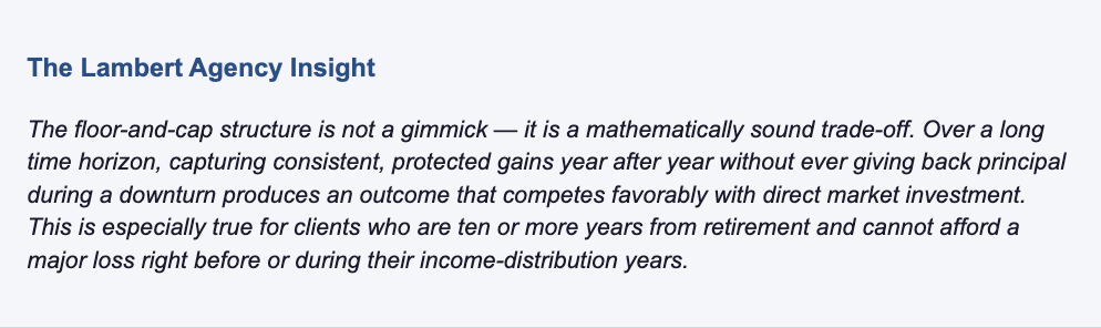 Some IUL products also incorporate a participation rate — the percentage of the index’s gain you are credited before the cap is applied. A participation rate of 80% on a year when the index gains 15% would credit you with 12% (80% of 15%) before the cap. Understanding all three variables — floor, cap, and participation rate — is essential to evaluating the true performance potential of any IUL policy. This is exactly the kind of side-by-side analysis we perform with every client at The Lambert Agency.