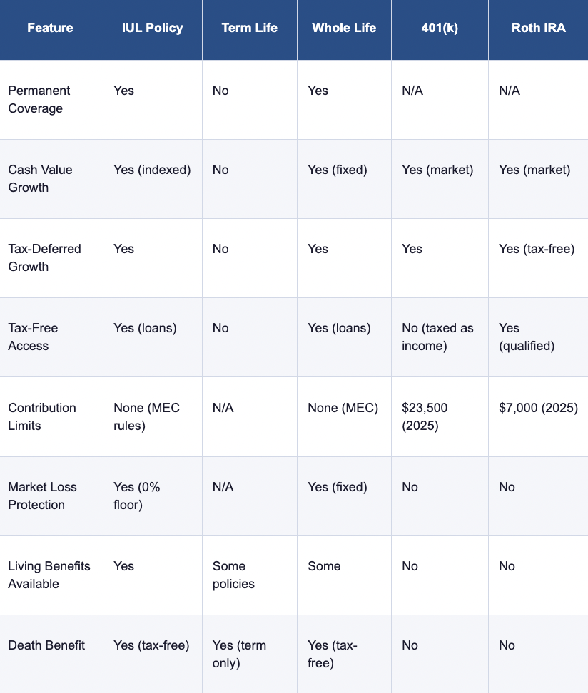 For high-income professionals and business owners in Austin who are already maxing out their 401(k) and Roth IRA contribution limits, an IUL offers an additional tax-advantaged bucket with no IRS contribution cap. This is a major advantage that is frequently overlooked in conventional financial planning conversations.