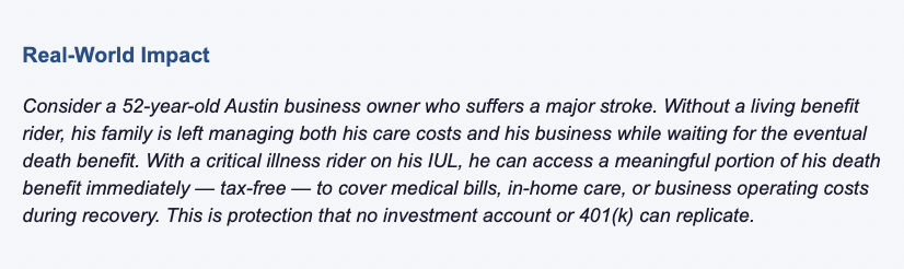 In a state like Texas, where healthcare costs can be staggering and where no state income tax means we often see higher-earners accumulating more in liquid assets, a living benefit rider can be the difference between financial security and financial ruin during a major health crisis. Many of these riders come at no additional premium cost — they are built into the base policy by the carrier.