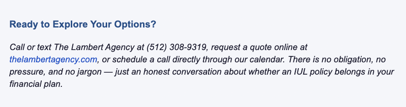 At The Lambert Agency, we believe in full transparency. We are not here to sell you a product — we are here to help you make the right decision. And the right decision requires an honest conversation about the risks and limitations of IUL policies as well as their benefits.